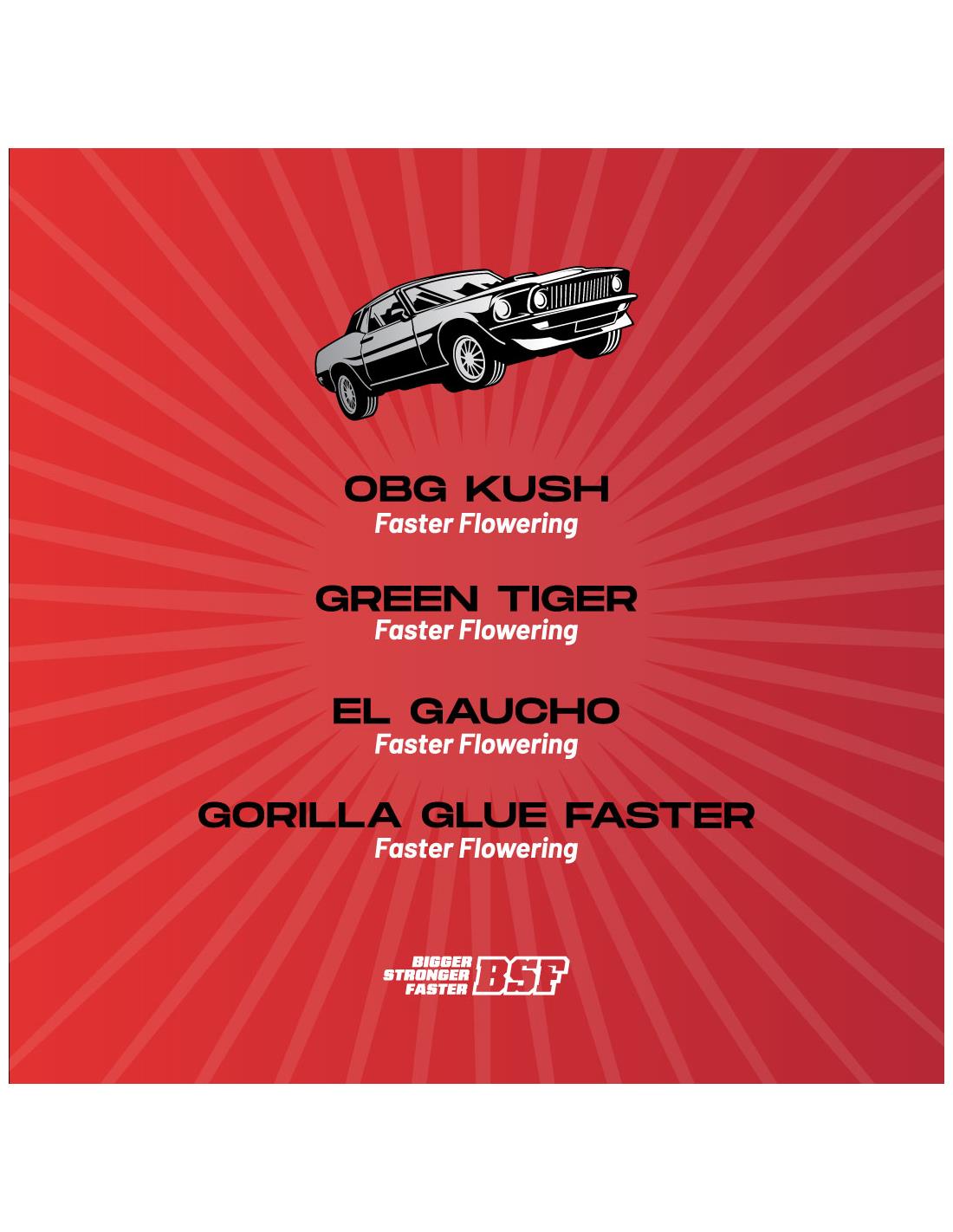 Faster and Furious Mix BSF Seeds presenta Faster and Furious Mix, un mix de semillas de floración rápida con las cuatro variedades Faster Flowering del catálogo Bigger Stronger Faster; OBG Kush, Green Tiger, Gorilla Faster y El Gaucho, todas separadas en burbujas independientes. Las Faster Flowering o de floración rápida son fotoperiódicas con un tiempo acotado de floración.