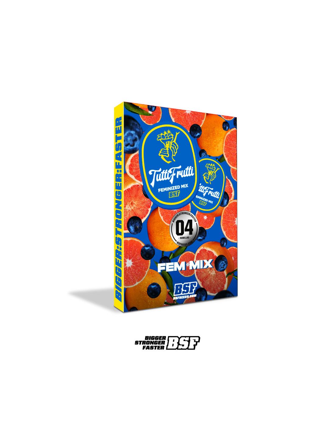 Tutti Frutti Feminized Mix. BSF Seeds presenta un nuevo mix fotoperiódico (feminizado) que te hará agua la boca. Tutti Frutti Feminized Mix, es una selección de las 4 variedades más frutales y feminizadas de BSF Seeds; Blueberry, Rainbows, Orange Blossom, y Pineapple Larry OG, separadas en burbujas independientes.