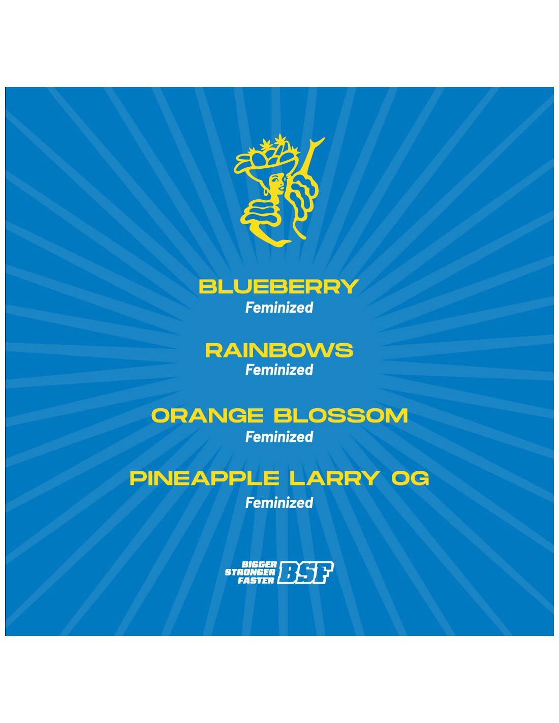 Tutti Frutti Feminized Mix. BSF Seeds presenta un nuevo mix fotoperiódico (feminizado) que te hará agua la boca. Tutti Frutti Feminized Mix, es una selección de las 4 variedades más frutales y feminizadas de BSF Seeds; Blueberry, Rainbows, Orange Blossom, y Pineapple Larry OG, separadas en burbujas independientes.